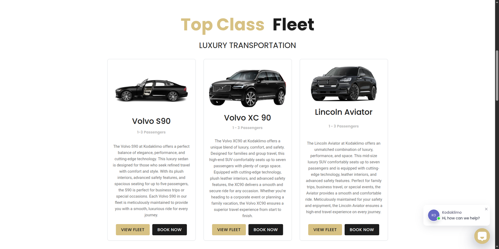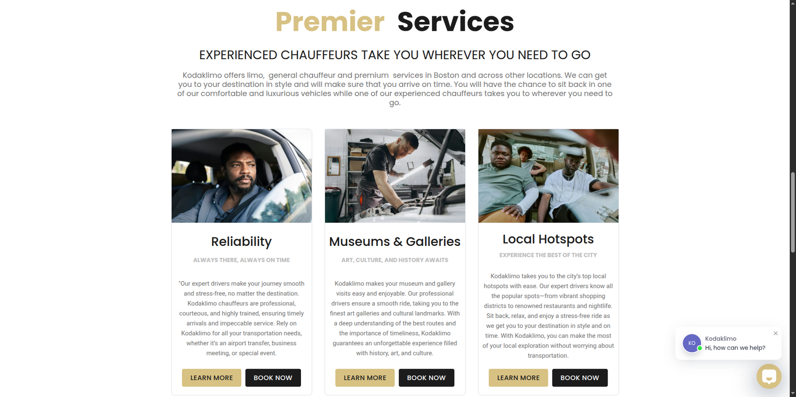 Kodak Limo is a professional luxury transportation website developed for a high-end car service based in Boston, MA, offering premium limousine, SUV, and black car services for airport transfers, corporate travel, events, and VIP clients. Built using WordPress with custom responsive design and intuitive navigation, the site showcases service offerings, fleet details, and an easy online booking experience.