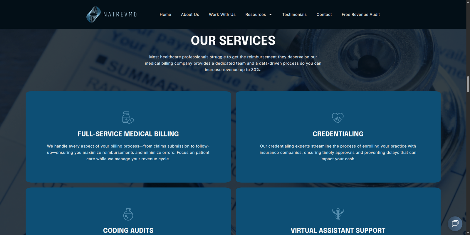 NatRevMD is a professionally structured website developed for a physician‑led medical billing and revenue cycle management firm serving private practices in the United States. The platform clearly communicates comprehensive services such as full‑service medical billing, coding audits, credentialing support, and operational optimization to help practices increase collections, improve workflow efficiency, and focus on patient care rather than administrative burden.