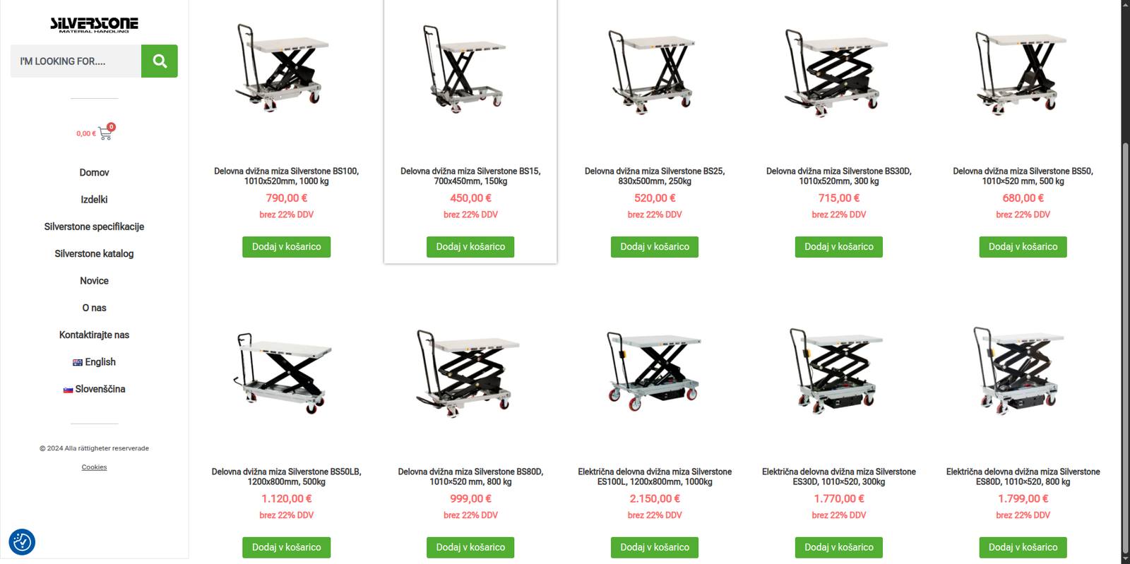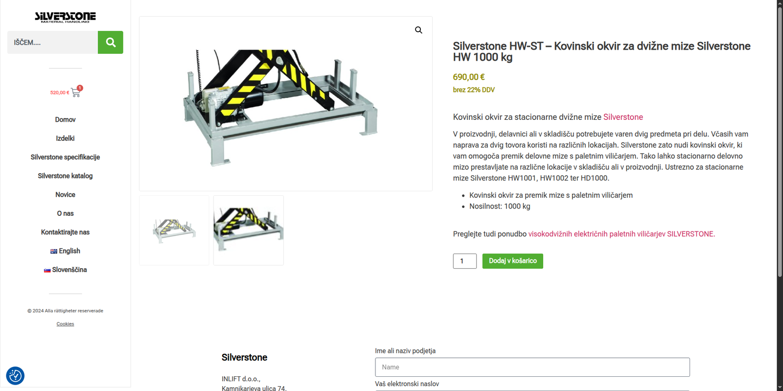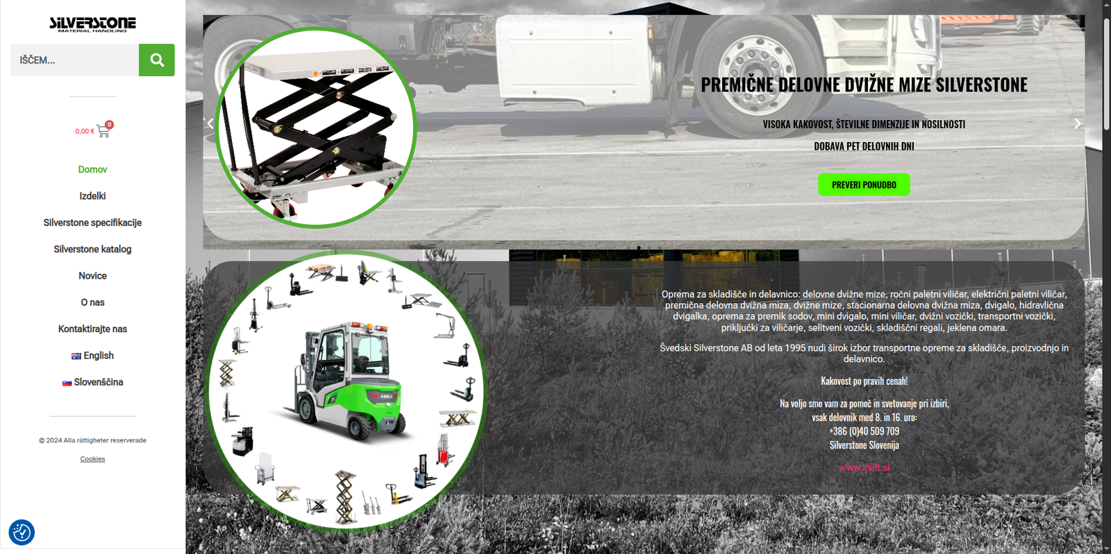 Silverstone Slovenia is a responsive e-commerce website built for a warehouse and workshop equipment supplier offering products such as forklifts, hydraulic lift tables, pallet trucks, mini lifts, shelving, industrial cabinets, and transport equipment. The site was developed using WordPress with WooCommerce to provide a structured product catalog, multi-language support, and seamless shopping experience for both Slovenian and international users.